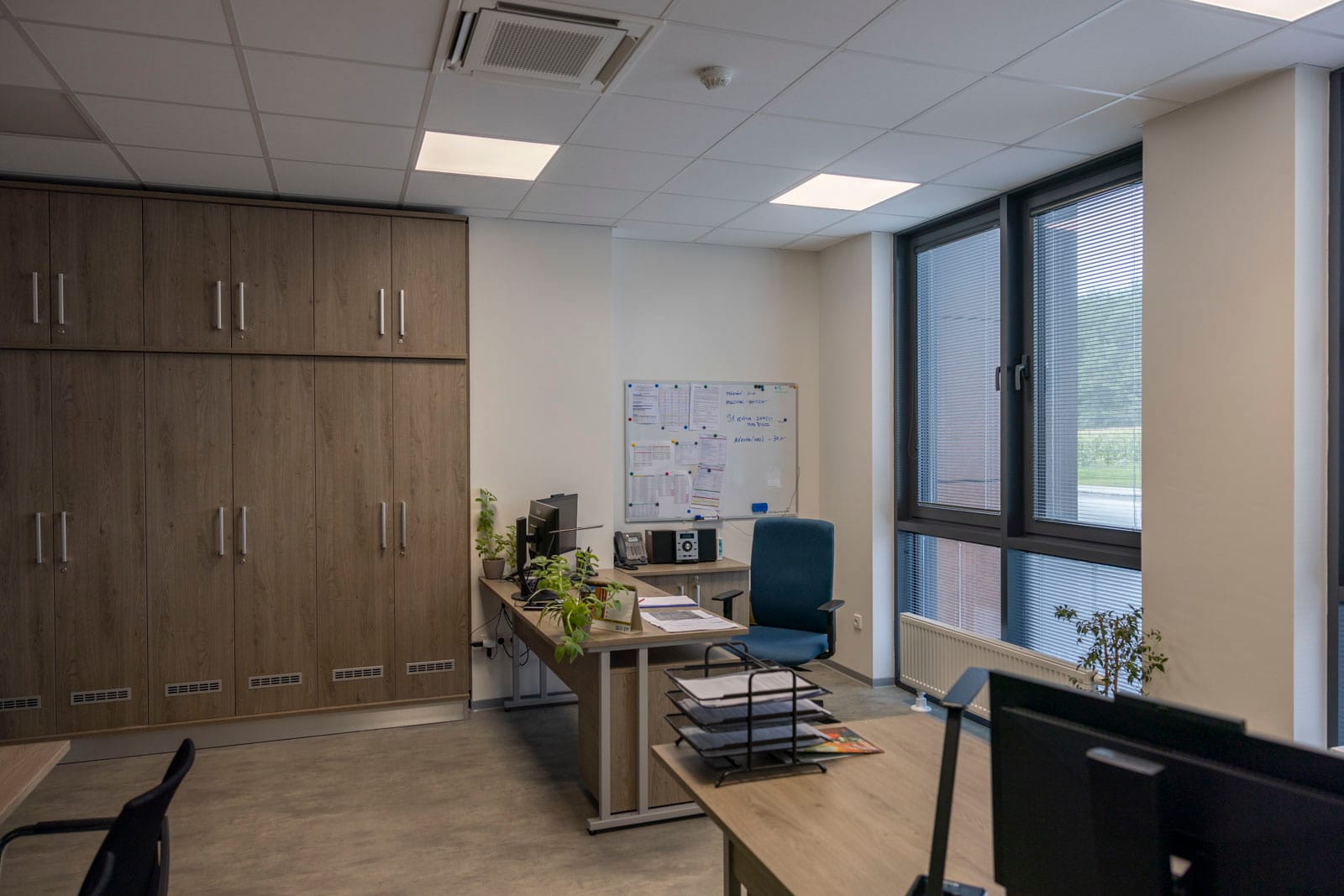 Obdélníková stavba, která je situovaná vprostřed pozemku, je výškově rozdělena na několik částí. Provoz je rozdělen na kancelářské plochy, společné prostory a část určenou pro techniku. Směrem k západní části je pak dvoupodlažní objekt ještě výškově akcentován převýšeným prostorem pro tělocvičnu. Z konstrukčního hlediska se jedná o monolitický skelet se zdivem v administrativní části, prefabrikovaný ŽB skelet v garážích s výplňovým zdivem. Tělocvična ve 3. nadzemním podlaží je pak řešena jako dřevokonstrukce z CLT panelů