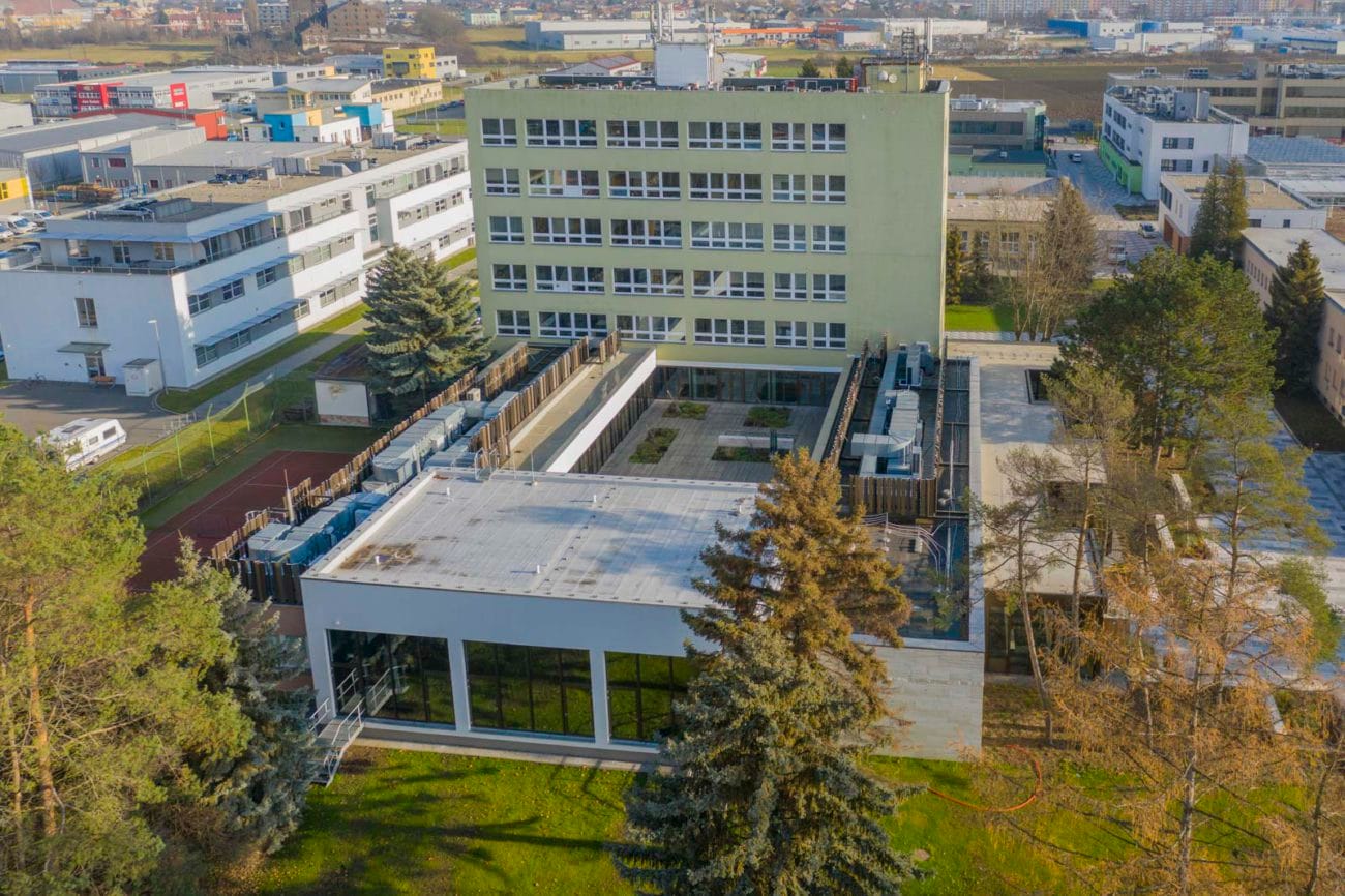 Nově vybudovaná část jižní přístavby respektuje již vzrostlou zeleň a byla tomu dispozičně uzpůsobena. Nově vybudované seminární místnosti i prostory pro individuální studium jsou tak společně s prosklenými vstupy doslova prostoupeny zelení. U veškerého použitého materiálu jsme pak kladli důraz především na přirozenost a harmonii. Pravidelný rastr z modřínového dřeva na podpůrných ocelových sloupcích a průběžný lamelový modřínový akustický podhled sjednocují jednotlivé prostory. Spolu se zemitým industriálním nádechem betonové stěrky na stěnách a stěrkou v barvě antracitu na podlahách se tím rozmlžuje hranice mezi interiérem a exteriérem. Hliníkové plochy prosklených fasád jsou pak laděny do bronzového nádechu a v místech jsou doplněny o přírodní kamenný obklad.