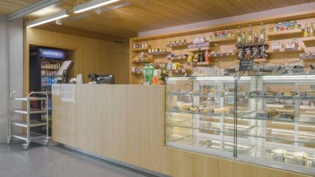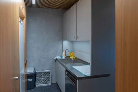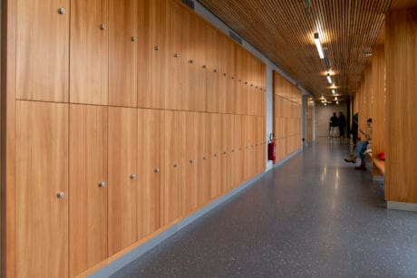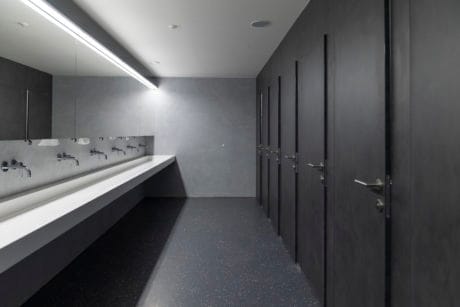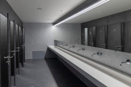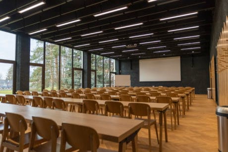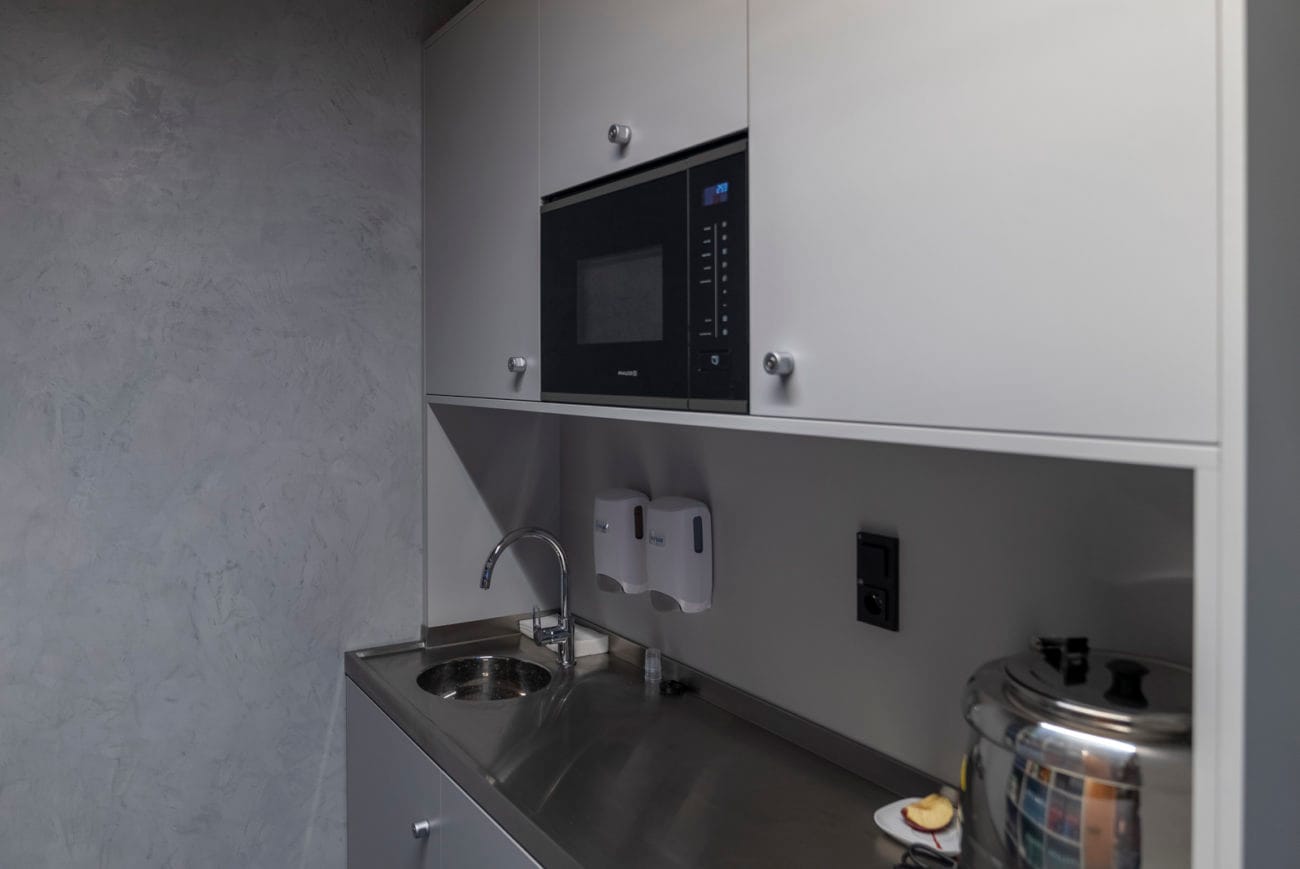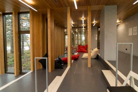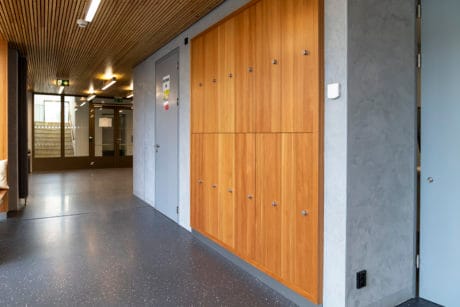 Nové místnosti jsou situovány v severovýchodní části objektu. Vstupní hala může v budoucnu sloužit jako šatna. Navazuje na ni šatna pro zaměstnance a hygienické zázemí. Nejzásadnějším prvkem je pak nová denní místnost. V prostorách jsme vybourali příčky i výplně otvorů a odstranili nášlapné vrstvy podlah. Nové vnitřní příčky jsme zbudovali z keramických tvárnic a významným novým prvkem je i akustický modřínový podhled. Podlahy jsme pokryli stěrkami. Větrání prostor jsme zajistili pomocí rekuperační jednotky.