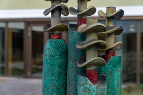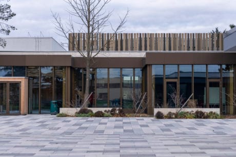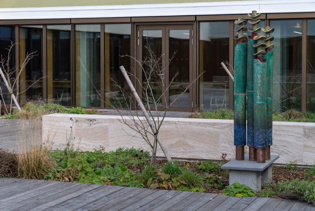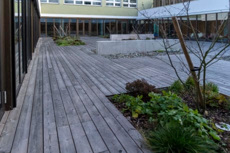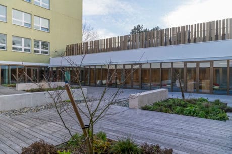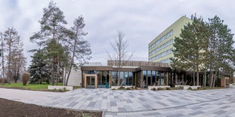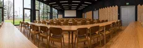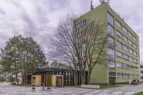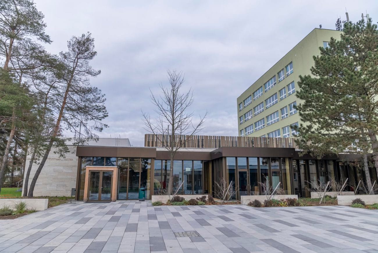 Nově vybudovaná část jižní přístavby respektuje již vzrostlou zeleň a byla tomu dispozičně uzpůsobena. Nově vybudované seminární místnosti i prostory pro individuální studium jsou tak společně s prosklenými vstupy doslova prostoupeny zelení. U veškerého použitého materiálu jsme pak kladli důraz především na přirozenost a harmonii. Pravidelný rastr z modřínového dřeva na podpůrných ocelových sloupcích a průběžný lamelový modřínový akustický podhled sjednocují jednotlivé prostory. Spolu se zemitým industriálním nádechem betonové stěrky na stěnách a stěrkou v barvě antracitu na podlahách se tím rozmlžuje hranice mezi interiérem a exteriérem. Hliníkové plochy prosklených fasád jsou pak laděny do bronzového nádechu a v místech jsou doplněny o přírodní kamenný obklad.